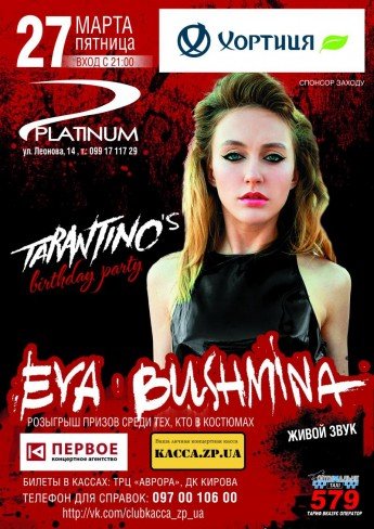Вы любите фильмы Квентина Тарантино, его неподражаемый стиль как режиссера и актера. Тогда приглашаем отпраздновать день рождения К.Тарантино вместе с kacca.zp.ua и НК Platinum. Костюмированая вечеринка для всех поклонников режиссера и актера К. Тарантино. Мы дарим возможность окунуться в неповторимую атмосферу поистине талантливого человека. Приятный сюрприз для именинников этого дня. Много конкурсов с призами и хорошее настроение. Специальный гость вечеринки Ева Бушмина (живой звук). Розыгрыш призов среди тех, кто придет в костюмах.
