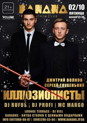 Основной зал– клубный формат - за пультом Dj Profi и Dj Rufus. Вечер и конкурсы ведет MC Margo. Танцевальная поддержка Art-Go Banana.