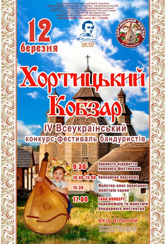 Конкурс-фестиваль «Хортицкий Кобзар» - культурно-художественная акция в честь достойного чествования 202-летнего юбилея Великого Кобзаря Украины Тараса Григорьевича Шевченко. В знак почтения каждый бандурист-вокалист исполнит произведение на слова Тараса Шевченко.