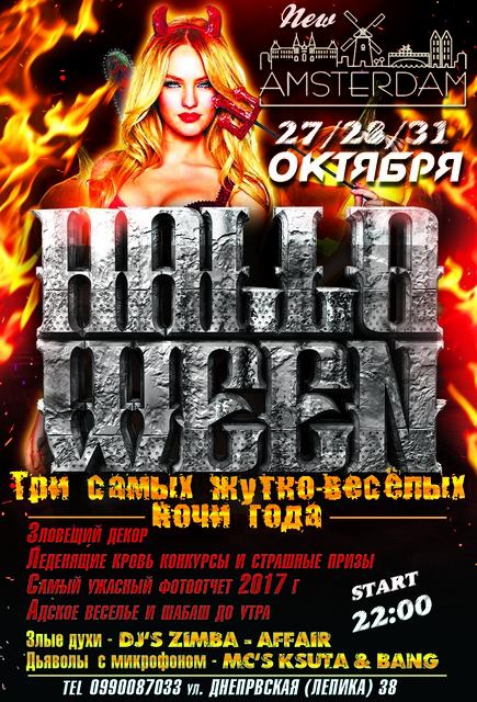 Трепещите дамы и господа! Это будет самый грандиозный конец октября! В канун зловещего праздника всех святых и грешных Вас ждет самое страшное событие года! Три ночи мы будем изгонять нечистую силу так, как ее не изгонял еще никто! Мистические декорации и по-настоящему страшная атмосфера, сумасшедшие эмоции и ужасающие подарки ! Готовьте костюмы, бутафорскую кровь и удобные ботинки – будет громко, жутко - весело и жарко! До 00:00 всем коктейль «Кровь дьявола» бесплатно в неограниченном количестве! Специально для Вас мы приготовим устрашающие блюда и до смерти вкусные коктейли!