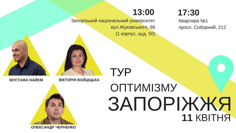 Новые лица украинской политики посетят Запорожье 11 апреля члены Межфракцинного депутатского объединения "еврооптимистам" Мустафа Найем, Виктория Войцицкий, Александр Черненко встретятся с горожанами в рамках Всеукраинского тура Оптимизма. 13:00 - открытая лекция в Запорожском национальном университете (ул. Жуковского, 66, 1 корпус, ауд. 50,). Регистрация: https://docs.google.com/forms/d/e/1FAIpQLSd703UDRxcaYlr9BTl5dY6aG1TLeki3BjQrhc38Ba8_Xqd6og/viewform