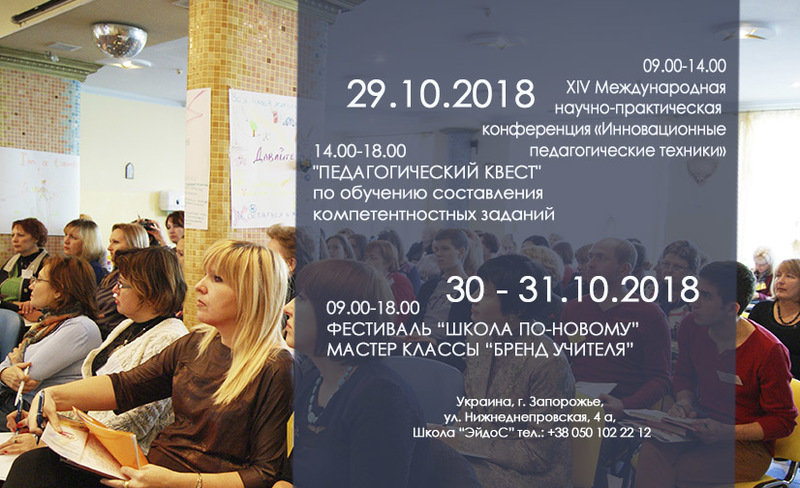 Приватний комплекс безперервної освіти «Школа «ЕйдоС» запрошує педагогів та вчителів м. Запоріжжя та Запорізької області взяти участь в XIV Міжнародній науково-практичній конференції «Інноваційні педагогічні техніки» та у щорічному фестивалі «Школа по-новому» з TRIZ-педагогіки, ейдетики, компетентнісного підходу та навчальних тренінгах.