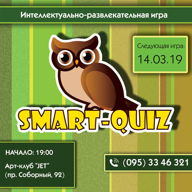 "SMART-QUIZ" В Арт-клубе «Jet» - интеллектуально-развлекательная командная игра, где Вы отвечаете на интересные вопросы, с помощью логики, смекалки и наблюдательности!