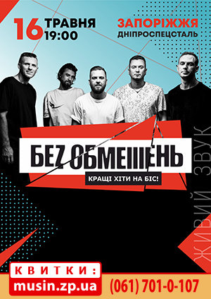 Без обмежень / Without Limits – рок-бенд, который гармонично плывет по волнам украинской музыки, периодически пропадая для записи нового альбома, а потом триумфально возвращаясь на большую сцену, чтобы порадовать поклонников результатами проделанной работы. В честь выхода нового альбома “Буду з тобою” группа отправляется в большой тур по Украине. Будете ждать их в Запорожье? Тогда запишите себе дату 23 ноября, место: ДК "Днепроспецсталь". А лучше приобретайте билеты заранее – он сам будет постоянно напоминать вам о грядущем концерте.
