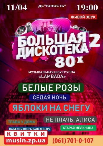 Концерт «Большая Дискотека 80» – это совершенно новая шоу-программа. Для Вас выступит зажигательная музыкальная шоу-группа «LAMBADA», которая объединила в себе ярких, веселых, харизматических музыкантов и вокалистов нашей страны! Ребята исполнят самые известные хиты эстрады 80-ых годов в новом современном звучании: Белые Розы, Синий Иней, Седая Ночь, Старая Мельница, Летящей Походкой, Яблоки на Снегу, Мадонна, Букет, Трава у Дома и многие др.