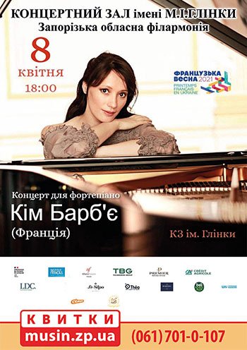 Запорожским слушателям известная французская пианистка Ким Барбье представляет исполнение шедевров классической музыки:В.А.Моцарт. Вариации на популярную французскую песню "Ah vous-dirais Maman!" До-мажорГ. Форе. Баркарола №1Г.Форе. Ноктюрн No 4 Ми-бемольМ. Равель. Рavane pour une infante défunteФ. Шопен. Ноктюрны op.9 -15Дж. Верди- Ф. Лист. Парафраз на тему "Риголетто"
