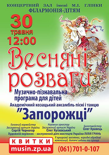 Музыкальная программа для детей Яркая познавательная программа "Весенние развлечения" раскроет чудесный мир народных традиций, музыкальный колорит веснянок, подарит неповторимую энергетику украинского танца. Весенний веночек ярких мелодий и многоголосного пения, зажигательных танцев и лирических хороводов, театральных постановок и виртуозных наигришей. "Благослови мама, весну призывать, весну призывать, зиму провожать", поётся в народной песне - веснянке.