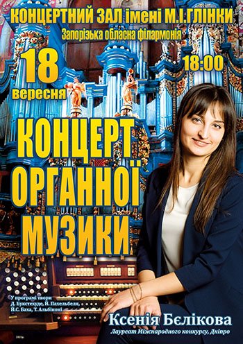 За пультом органа - солистка-органистка Днепропетровского дома органной и камерной музыки, лауреат Всеукраинских и Международных конкурсов Ксения Беликова. В репертуаре музыканта - лучшие произведения мировой органной и инструментальной классической музыки. Спектр ее исполнительского мастерства охватывает произведения композиторов от добаховской эпохи до ХХ века. Ведущее место в программах органистки занимают произведения украинских авторов. Ксения успешно выступает с камерными и симфоническими оркестрами, гастролирует по Украине, странам ближнего и дальнего зарубежья. Артистка - участница Международной Баховской академии (Днепр, 2016, 2018).