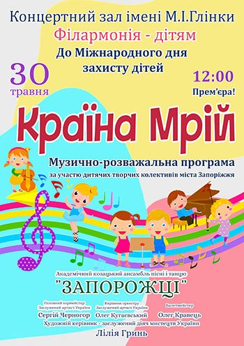 Поэтому, 30 мая, накануне Международного дня защиты детей, Запорожская областная филармония приглашает детишек в волшебную Страну Мечты!