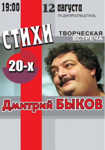 Больше чем поэт – это ум, честь и совесть нашей эпохи! Несмотря на то, что в наш век в вышеупомянутом государстве ум и совесть не всегда в чести, Дмитрий не поступается своим принципам. В чем Вы можете убедиться лично, придя на творческую встречу с поэтом. Дмитрий Быков – поэт, публицист, писатель и просто талантливый человек, не разучившийся думать, чем буквально «заражает» своих слушателей. Большинству зрителей Дмитрий знаком, как автор проекта «Гражданин-поэт» - пример вымирающего на сегодня жанра острой политической сатиры. Не пошлой и вульгарной, которая сегодня заполонила нас, а интеллигентной и тонкой, заставляющей зрителя погружаться вместе с автором в процесс своего творчества.«Стихи-20х» - это то, что сам автор считает главным в своем творчестве на сегодняшний день. В чем Вы можете убедиться сами 12 августа 2021 года в 19.00 в ДК "Днепроспецсталь", приоткрыв дверь творческой «кухни» автора и поговорить с талантливым человеком, что называется «за жизнь», поняв, что Дмитрий Быков, действительно, больше чем поэт