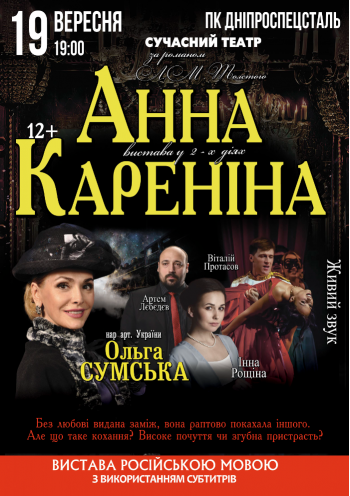 Сколько у романа было экранизаций? Каждый раз зритель с удовольствием и интересом ждет, как же будет показана легендарная судьба. С театральными постановками то же самое, особенно, если задействованы именитые актеры. В спектакле «Анна Каренина» играют: Ольга Сумская, Инна Рощина, Артем Лебедев, Виталий Протасов.К сожалению, мимо каждого из нас ежедневно проходят тени угасших женщин и мужчин, которые возвращаются в дом, давно превратившийся из очага в холодную пещеру. Мы все ищем счастье, но, как и у Анны, не у всех хватает сил довести бой до конца и отвоевать его. Или наоборот — признаться себе в том, что кажущееся счастье есть не более чем иллюзия. Впрочем, смотрите сами! Купить билет на спектакль «Анна Каренина», который состоится 19 сентября в 19:00 в ДК "Днепроспецсталь", можно прямо сейчас.