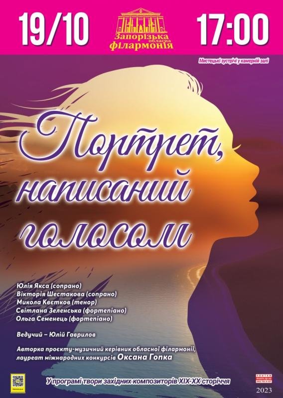 19 жовтня у Запорізькій обласній філармонії в рамках творчого проєкту «Мистецькі зустрічі у камерній залі» відбудеться прем'єра програми «Портрет, написаний голосом».