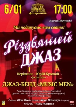 Джаз – це не лише музика, це – стан душі, де кожна нота має свою магічну неповторність. Коли ж цей стан збігається із найдивовижнішим періодом року, то можна неодмінно відчути, що дива таки трапляються. Повірити в це можливо, коли на сцені пануватимуть справжні джазові віртуози – джаз-бенд «Music men» під керуванням Юрія Крюкова. Популярні різдвяні хіти, сповнені особливої чуттєвості, та авторські імпровізації прозвучать у виконанні Тараса Пацернюка (труба), Дмитра Саверова (контрабас), Станіслава Шинкаренко (ударні), Тимофія Фуклєва (флейта), Івана Левченко (саксофон) та Юрія Крюкова (фортепіано). Особливої експресії та шарму джазовим композиціям додасть прекрасний вокал солісток філармонії Юлії Якси та Діани Остапчук.