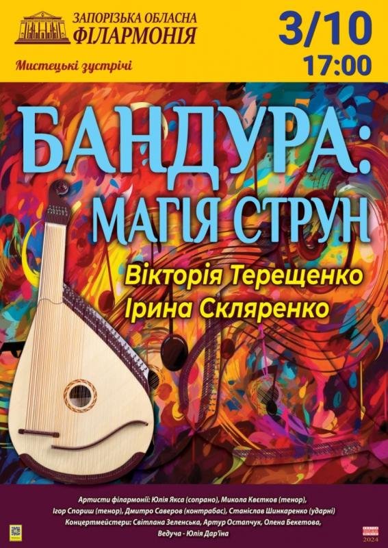 Запорізька обласна філармонія підготувала нову прем’єру - концертну програму «Бандура: магія струн», яка відкриває світ сучасного інструменту, в якому приховані фантастичні темброві барви й цілий світ образів та емоцій.