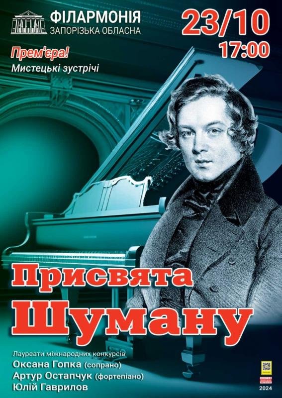 Запорізька обласна філармонія підготувала 5 жовтня справжнім поціновувачам елегантної класики прем’єру концертної програма «Присвята Шуману», створеної під орудою музичного керівника, лауреата міжнародних конкурсів Оксани Гопки.