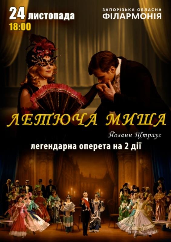 У вихорі віденських вальсів закрутилося і змішалося все – легкий флірт, святкові розіграші, любовні непорозуміння. Це маскарад, панове! Це – легендарна оперета «Летюча миша»! Легковажні веселощі, удавані сльози, мила брехня, уявний переляк … Все заплутується в клубках інтриг під звуки чарівних вальсів, польок, чардашу і канкану. Всі ховаються під масками, кожен видає себе за кого-небудь іншого: служниця за пані, залицяльник за чоловіка. Граціозна побутова комедія перетворюється на бурхливий розлив хмільного свята в першому акті, а комічний, гротескний фінал роз’яснює всі непорозуміння.