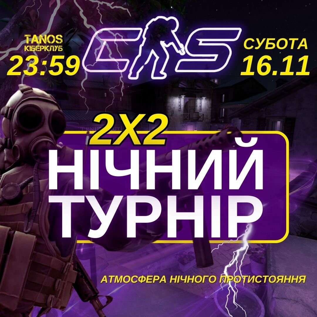 НІЧНИЙ ТУРНІР з CS2 2х2 в @tanos_cyberclub ⠀ КІБЕРНІЧ НА ПОВНУ ПОТУЖНІСТЬ