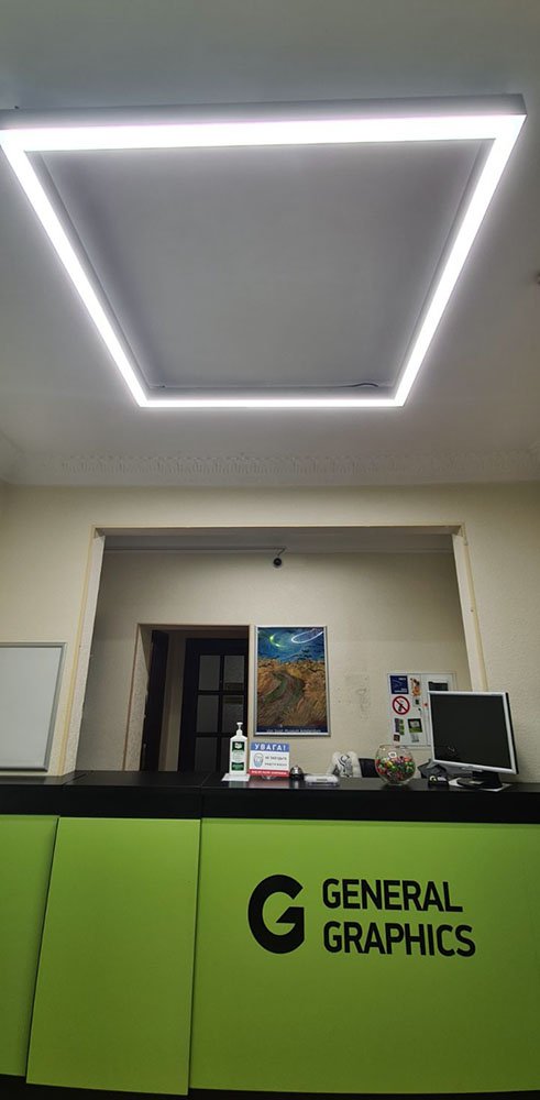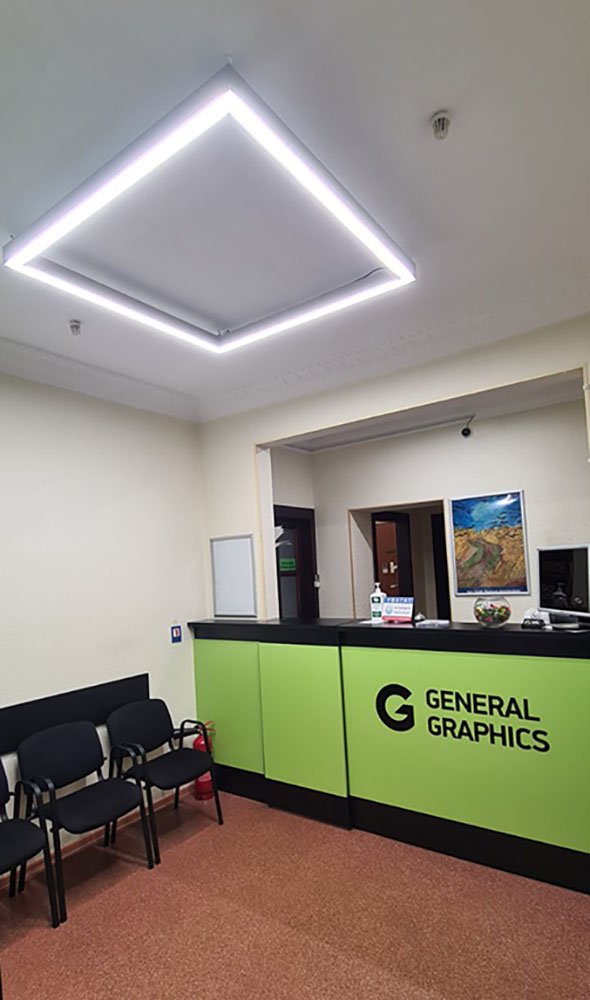 Цифровая типография General Graphics, Запорожье реализовала замену освещения для зоны ресепшен. При выборе светильников было очень важно подобрать светотехническое оборудование, которое будет максимально близко передавать цвет.