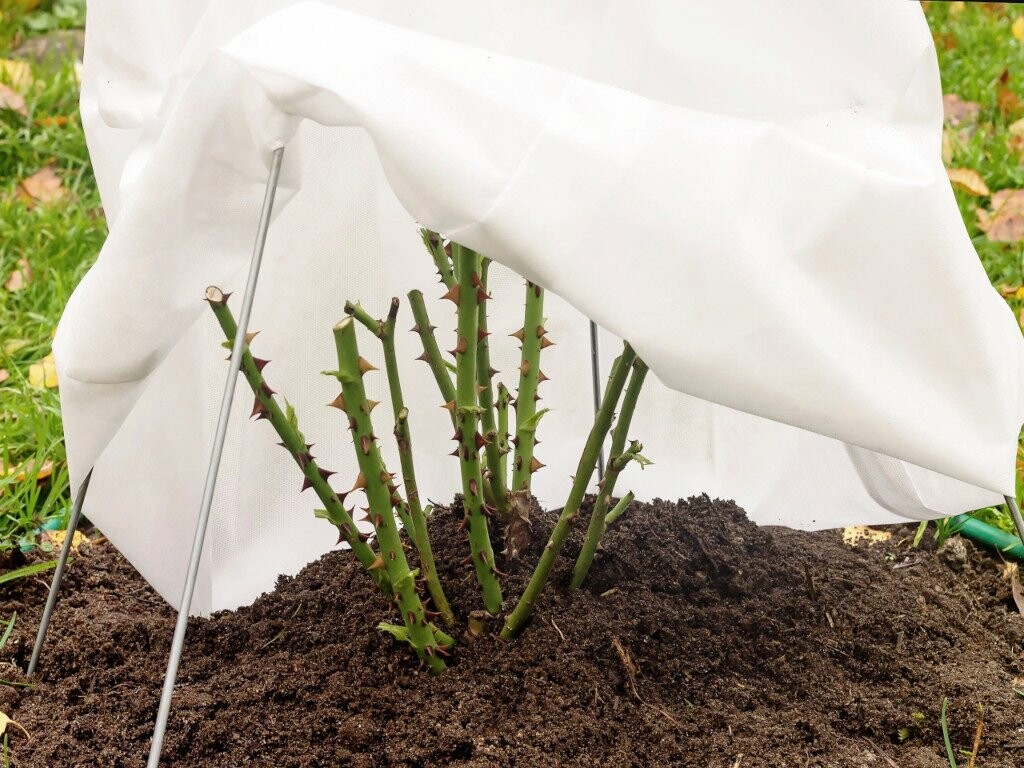 Для захисту від морозу троянди підгортають, роблячи над кореневою шийкою земляний горбик, після чого кущ зверху треба вкрити. Для укриття троянд найкраще підійде агроволокно.
