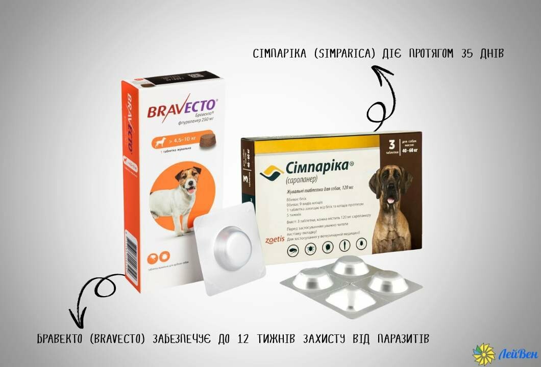- У тестах Simparica починає діяти вже за 3 години, а Bravecto — за 8–12 годин.