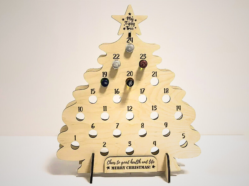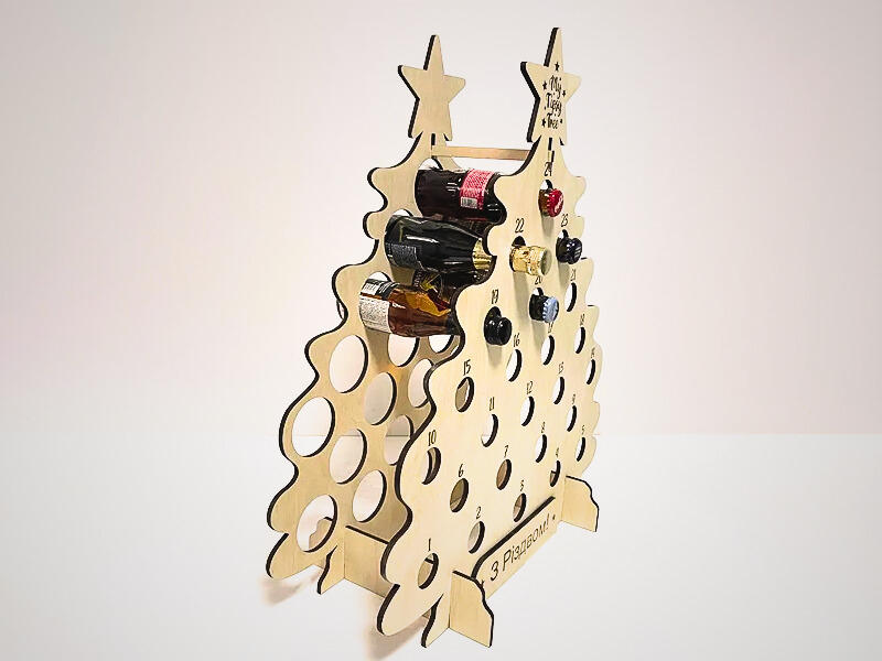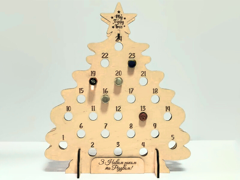 Традиційно адвент-календар — це набір отворів або коробочок, у яких ховаються маленькі сюрпризи на кожен день грудня. У нашому випадку це — дерев’яна ялинка з отворами для мініпляшечки улюблених напоїв: вина, віскі, настоянок, лікерів чи рому.