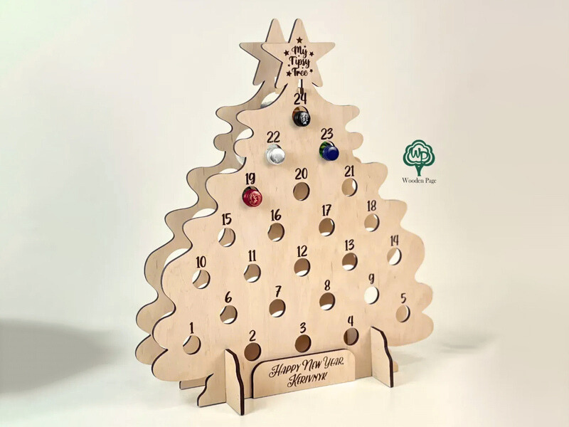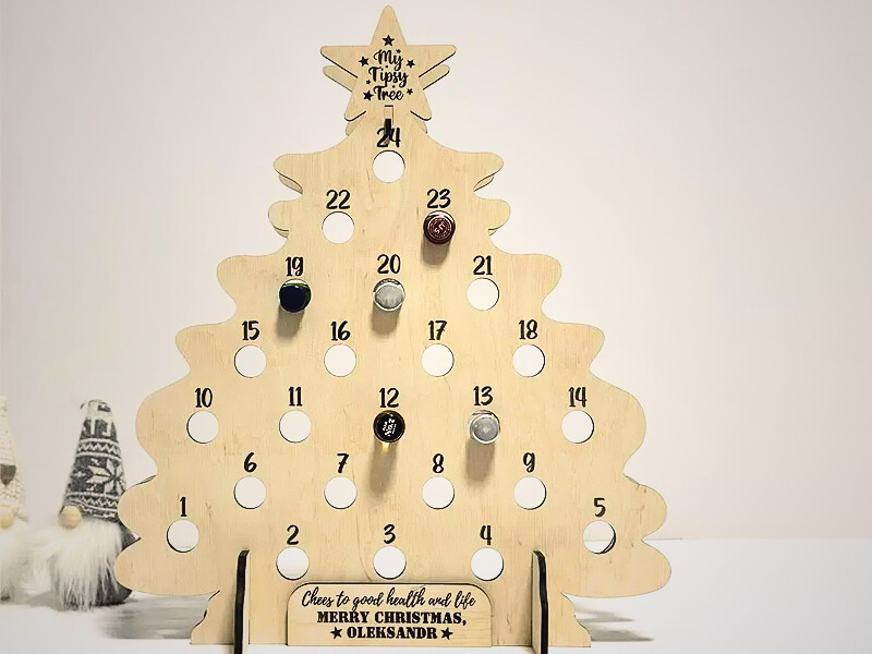 Окремої уваги заслуговує адвент-календар у формі ялинки для алкоголю — це справжня окрема прикраса інтер’єру. Він не лише виконує практичну функцію, а й створює різдвяний настрій у домі чи офісі. На таких моделях пляшечки розміщені по “гілках” дерев’яної ялинки, утворюючи святкову композицію.