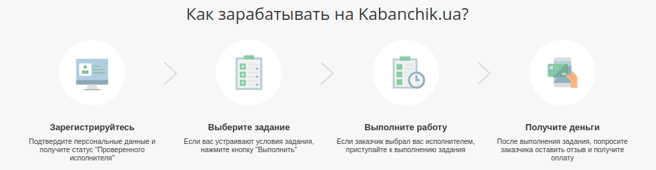 Можно рассмотреть принцип работы сервиса на примере. У жителя Запорожья ломается холодильник, и он ищет мастера, который придет к нему домой, чтобы быстро восстановить технику - пока не испортились продукты внутри. Он оформляет задание на ремонт холодильников на Kabanchik.ua. Указывает предельный срок ремонта, предлагает цену, описывает проблему. Система рассылает уведомления мастерам, подписанным на категорию. Желающие подают заявки, и заказчик выбирает одного из претендентов.