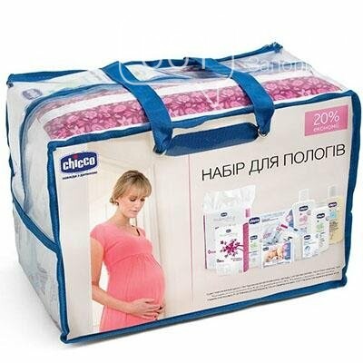 Стандартный набор для будущих мам состоит из продукции Chicco и включает детскую косметику, влажные салфетки,ватные палочки, салфетки и прокладки для груди, послеродовые прокладки и трусы.