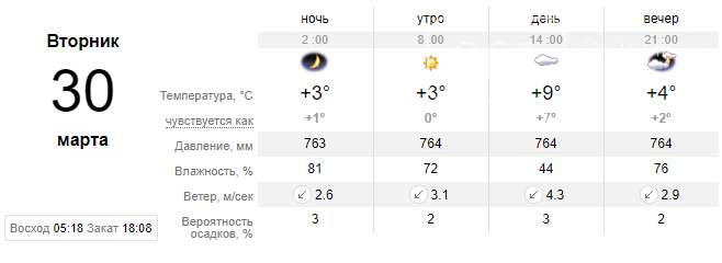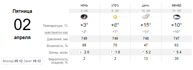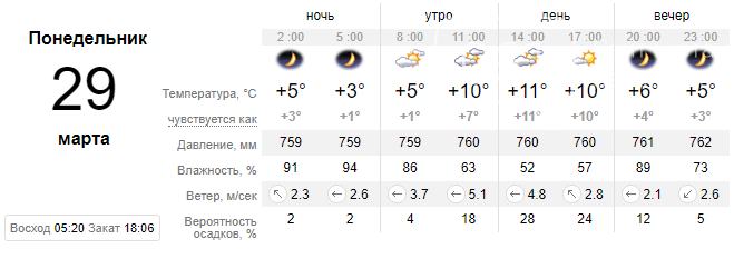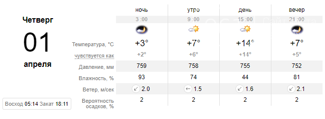 Неделя ожидается по-настоящему весенняя. Нарастающая температура воздуха к концу недели достигнет показателя в +15 °С. На небе уверенно будет преобладать солнце, с минимальной облачной активностью. Осадки синоптики не прогнозируют, за что им отдельная благодарность.