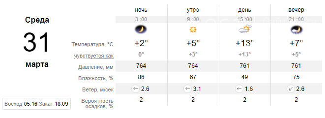 Днем на небе появятся капризные облака, которые к вечеру должны рассеяться. Зато, приятный показатель температуры воздуха в +13 °С должен скрасить временную серость дня. Осадков ожидать не стоит.