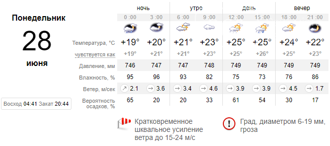 Согласно данным Укргидрометцентра, поступила информация, что 28 июня по городу Запорожье и на территории Запорожской области ожидаются грозы, днем местами град, шквал 15-24 м / с (I уровень опасности, желтый).