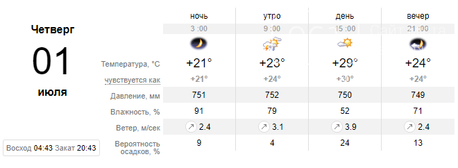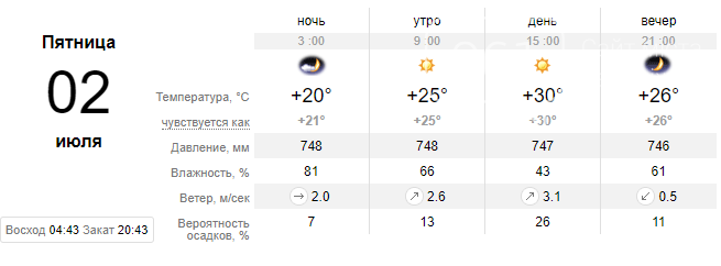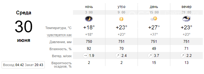 С утра и до вечера небо будет ясным и безоблачным, если верить прогнозам синоптиков. Температура возрастет до +30 °С в своем максимуме, а порывы ветра все так же останутся до 3-4 м/с. Осадков в этот день не предвидится.