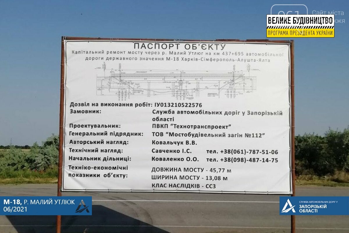 Мосту через р. Малый Утлюк уже более 70 лет - его построили в 1949 году. Он находится в Мелитопольском районе на трассе государственного значения М-18 Харьков-Симферополь-Алушта-Ялта. В результате обследования выяснилось, что сооружение имеет множество деффектных конструкций, усиление которых экономически не целесообразно, поэтому верховую часть моста решили ремонтировать капитально. Подрядчик уже приступил к работе.