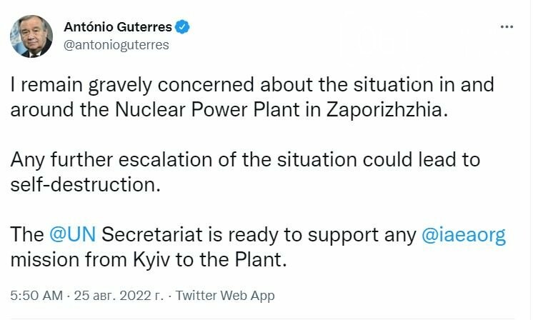 Секретаріат ООН готовий підтримати будь-яку місію МАГАТЕ з Києва на станцію”, - написав Антоніу Гутерріш у Twitter.
