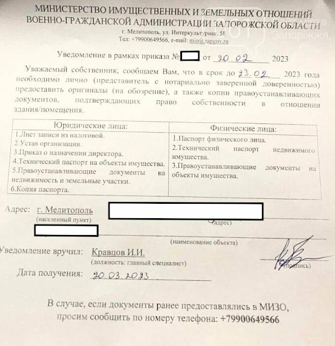 Окупанти Мелітополя змушують підприємців принести до фейкового міністерства оригінали документів на право власності на будівлі та приміщення. Місцева влада впевнена, що в такий спосіб окупанти можуть відібрати нерухомість.
