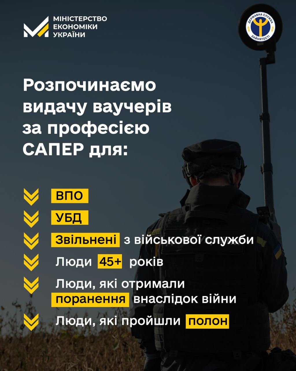 Нещодавно до Наказу Мінекономіки від 11.04.2023 року №204 було внесено важливі зміни, а саме – до переліку професій та спеціальностей, для навчання за якими може бути виданий ваучер для підтримання конкурентноспроможності осіб на ринку праці, було додано професію «Сапер».