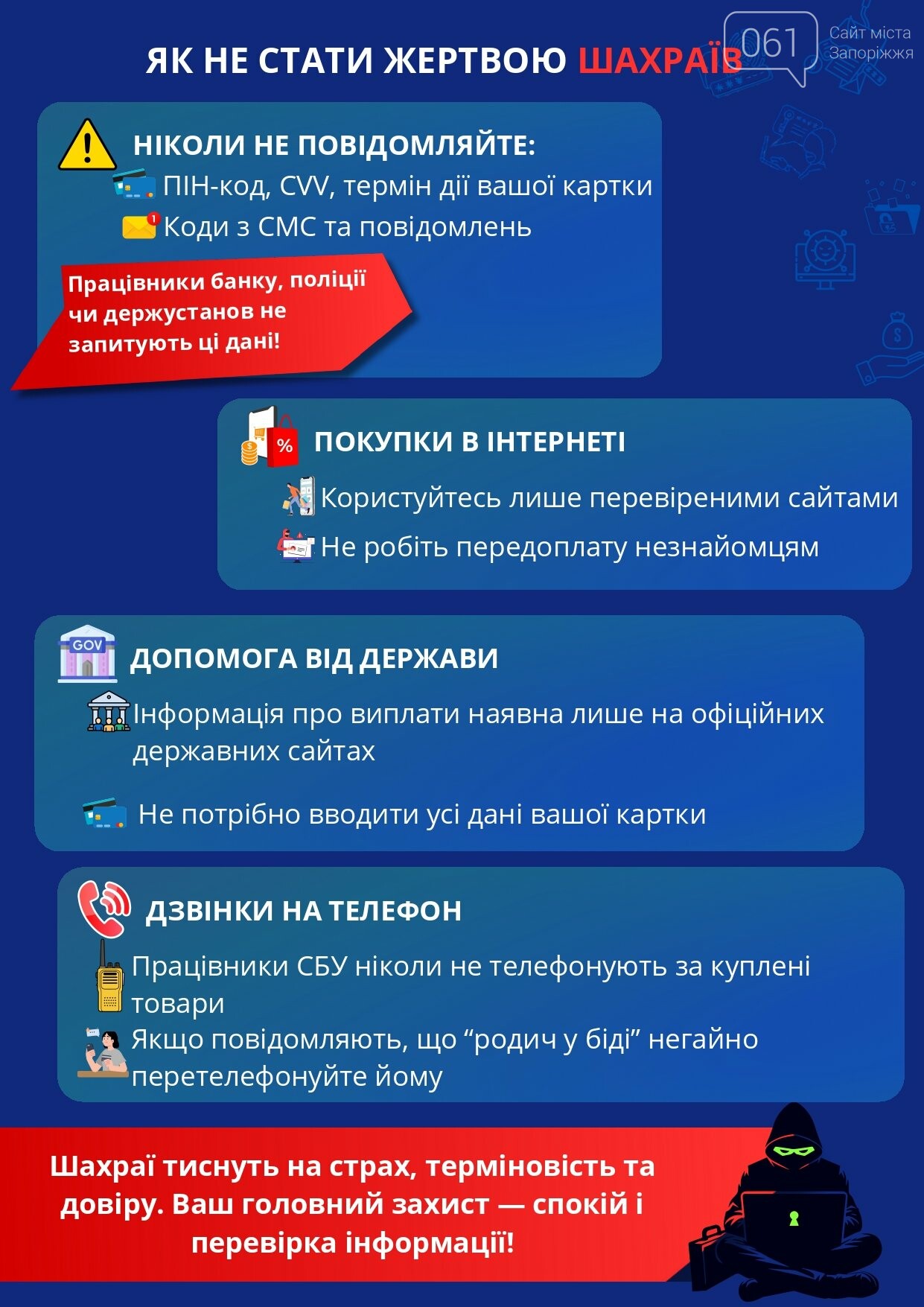 За даними поліції, на підконтрольній території Запорізької області лише за минулий рік було зафіксовано 1 500 кримінальних проваджень щодо шахрайств. Загальна сума завданих збитків – понад 73 мільйони гривень. Для порівняння на 73 мільйона гривень можна капітально відремонтувати укриття у 8 школах, трьох дитсадках та запроєктувати відновлення 10 житлових багатоповерхових будинків.